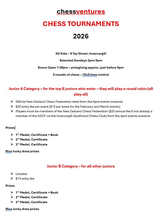 2 events were held on 22 February 2026 at XO Kids in Invercargill – the usual junior tournament, and for the first time, a tournament for adults/stronger juniors.